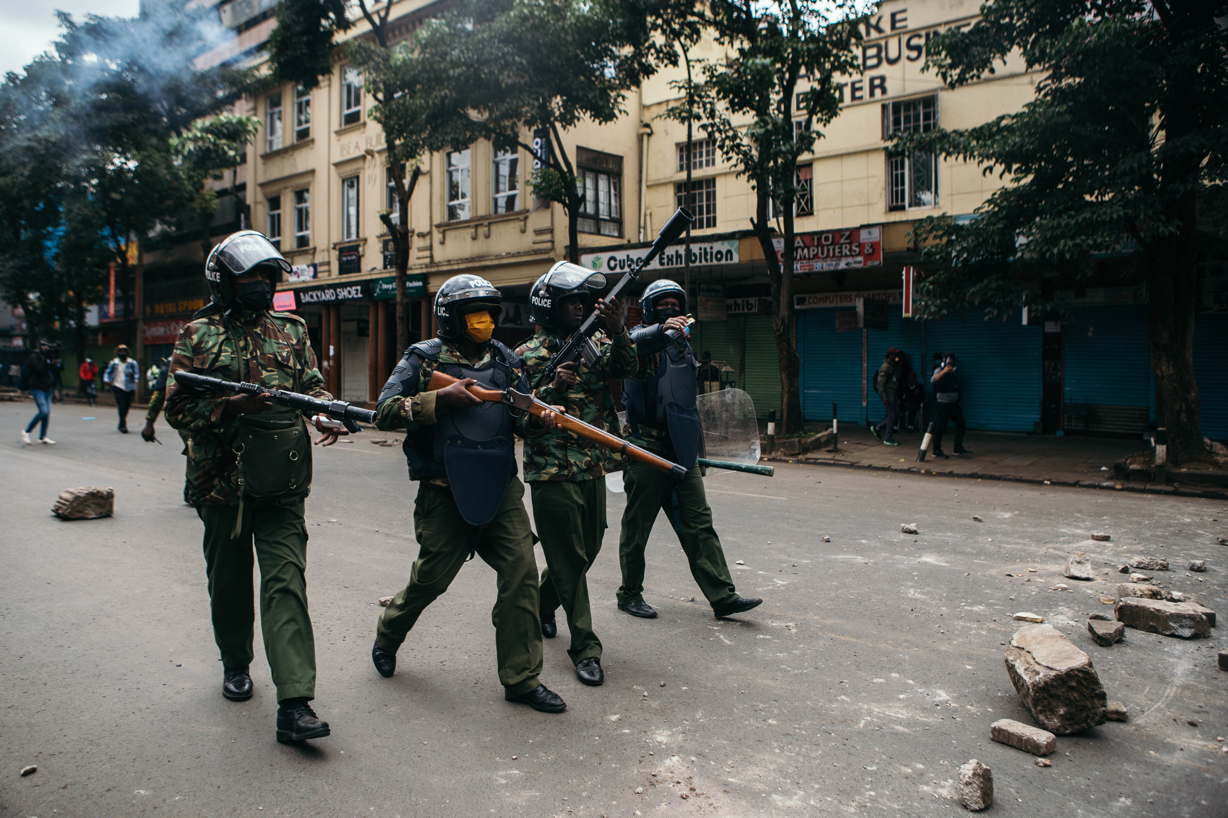 警察在肯尼亚内罗毕的抗议活动中巡逻,时间为6月27日。