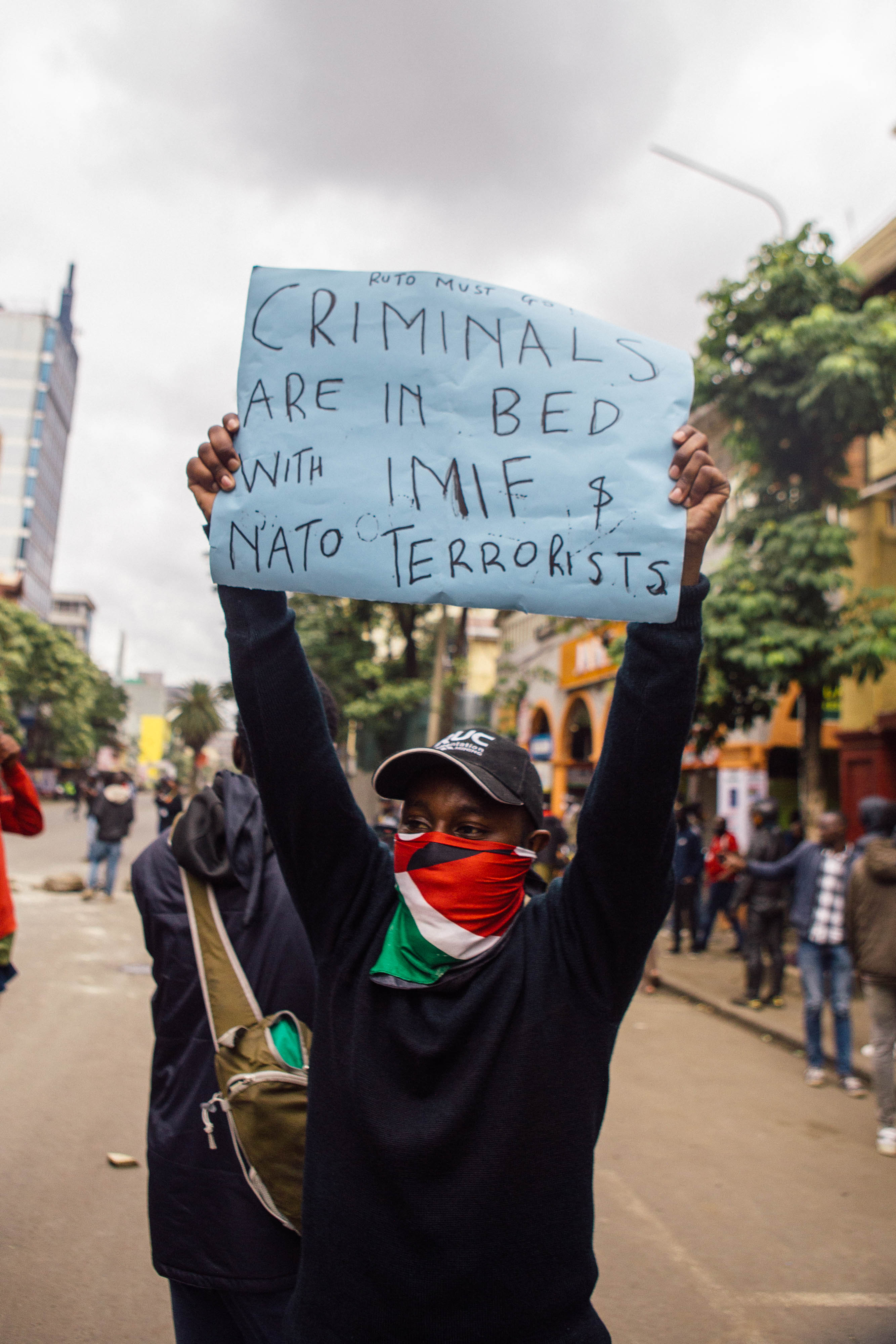 6月27日内罗毕的一名抗议者。摄影师:Kang-Chun Cheng/Bloomberg相反,他将被迫削减公共支出并增加借款,以确保这个1,070亿美元的经济体达到其与国际货币基金组织达成的财政目标。