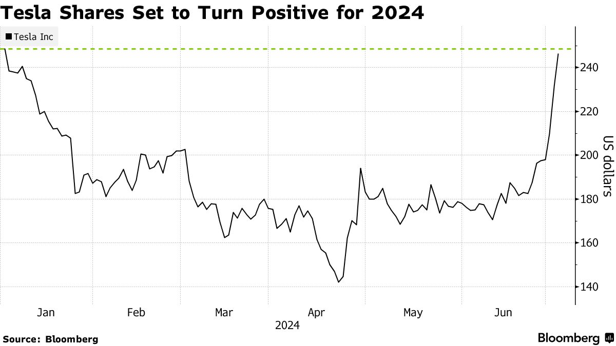 特斯拉股份有限公司 股价有望在周五连续第八个交易日上涨,使这家全球市值最高的汽车制造商的股票有望年内转为正值。