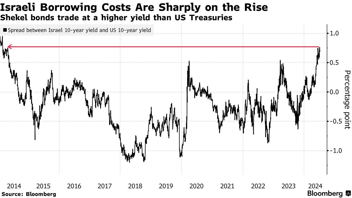 动荡正在波及市场,政府10年期谢克尔债券的收益率本月达到了13年来的最高水平,达到5.2%。自3月初以来,谢克尔对美元贬值近4%,在彭博跟踪的31种主要货币篮子中表现最差之一。