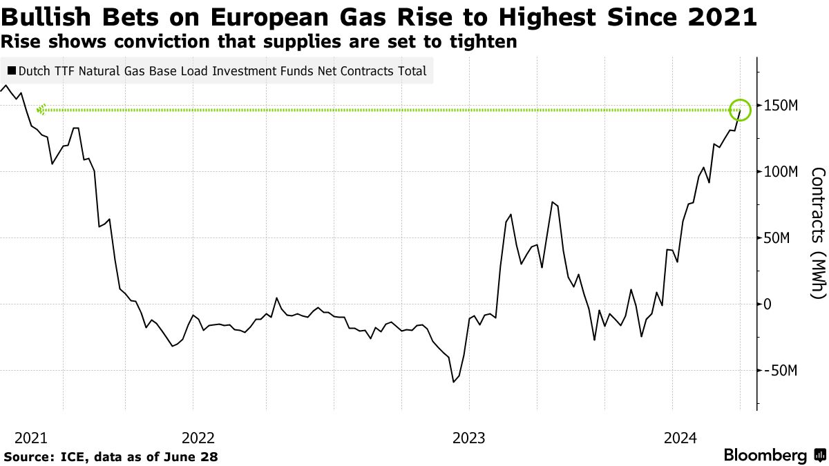 看涨欧洲天然气价格的投机性押注已经增加,加强了市场对供应将会收紧的信心。根据洲际交易所公司最新数据,投资基金持有的荷兰天然气期货的净多头头寸达到了自2011年11月以来的最高水平。这些看涨的投注表明市场对供应短缺的可能性仍然非常敏感,并且与更多美国天然气交易商寻求对冲该国天然气出口并对欧洲需求持有看法的情况相吻合,将大西洋两岸的交易联系起来。