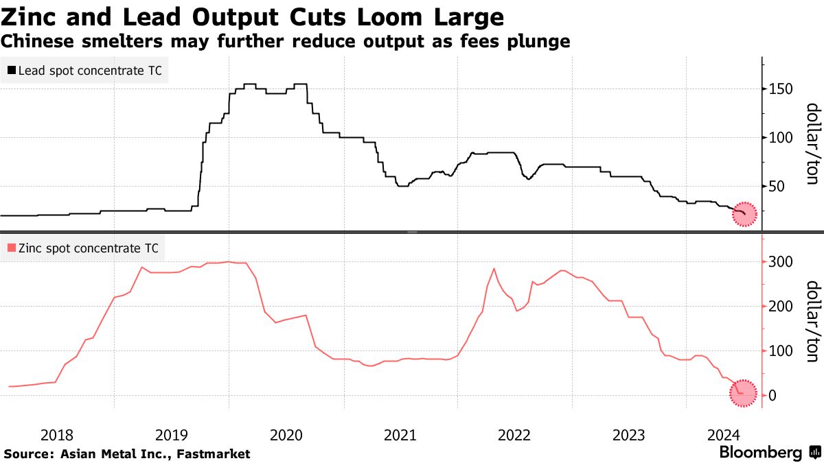 来自中国顶级供应商的锌和铅产量受到关注,投资者正在权衡该国冶炼厂进一步削减产量的可能性,此前现货处理费——加工利润的一个衡量标准——暴跌。锌精矿的所谓TC降至2016年以来的最低水平,而铅矿石的TC降至2018年以来的最低水平,全球矿山供应短缺。这被认为会支撑这两种基本金属的价格。