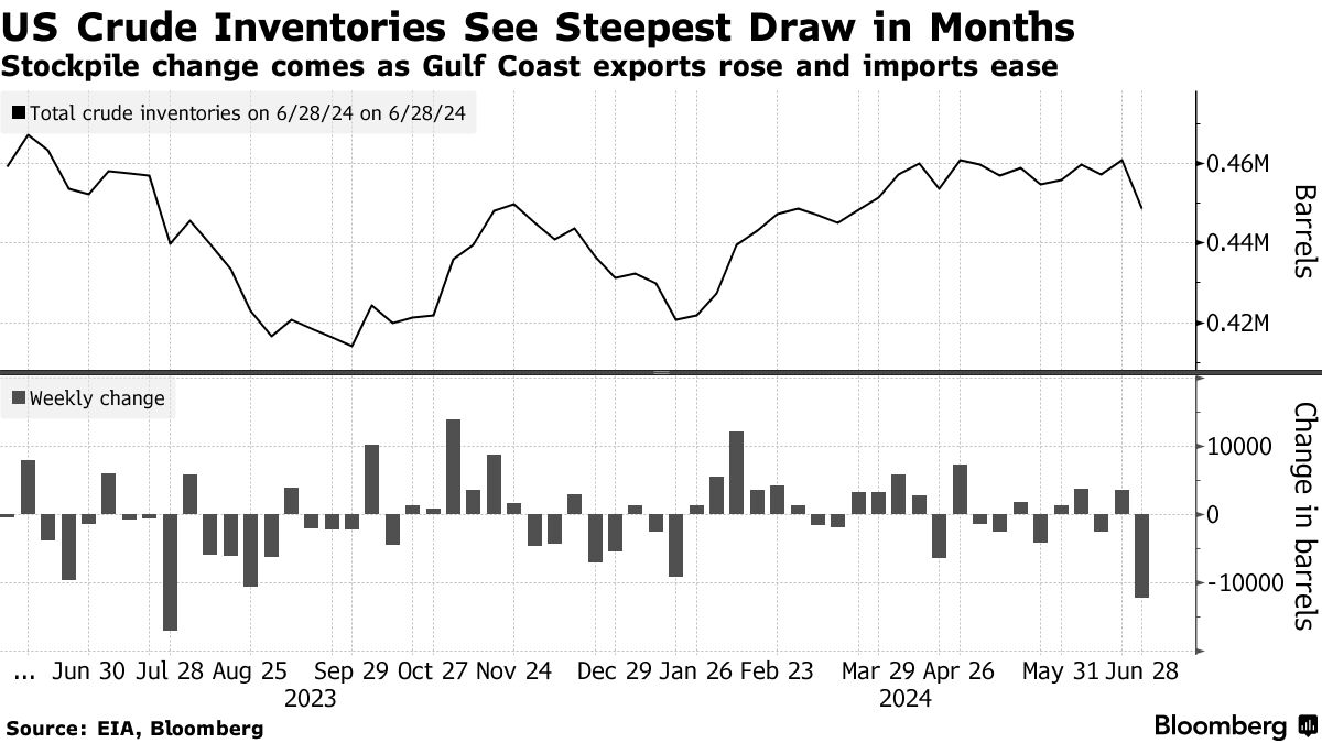 美国原油库存在截至6月28日的一周内出现了近一年来最大幅度的下降,根据能源信息管理局的数据,减少了1220万桶。库存的减少是由墨西哥湾地区推动的,那里的出口增加,进口减少。原油期货价格从6月初的低点上涨了近14%,库存消息以及汽油的利好数据正在帮助推动石油价格在北美夏季需求旺季初期。