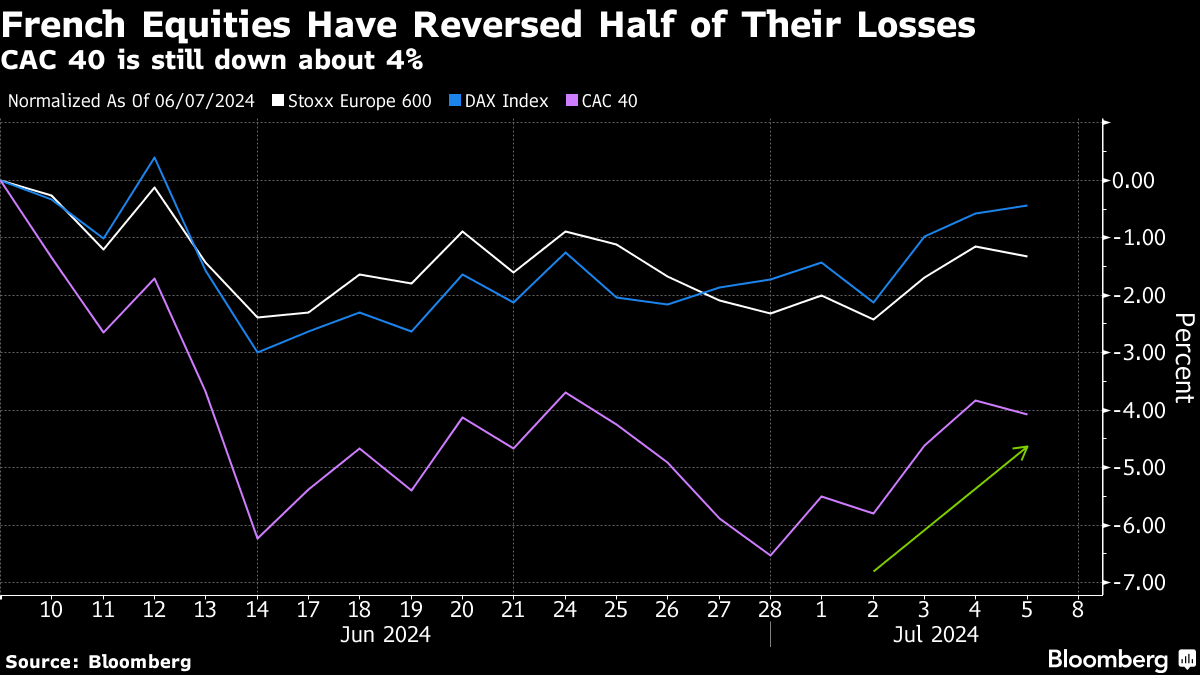 截至周末,法国CAC 40股指已经扭转自6月7日以来的损失约一半,仍然下跌4%。上周法国和德国债券收益率之间的差距也出现了类似的走势。