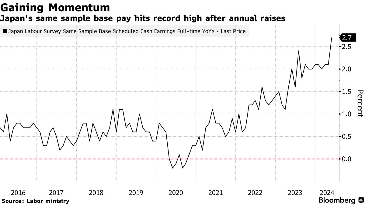 日本工人的基本工资自1993年以来增长最快,这一增长支持了日本央行考虑提高利率的理由,尽管实际工资继续下降。