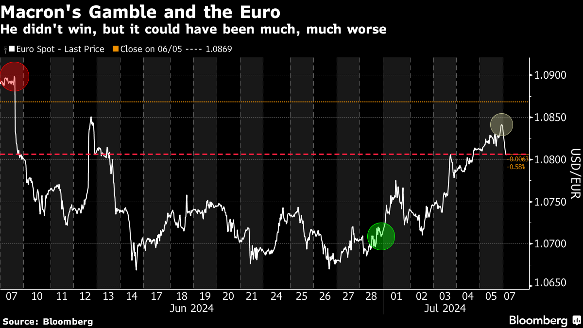 周日,在英吉利海峡对岸,法国人却搞出了一个相当惊人的事情。在数周来一直担心极右翼国民集会(RN)的玛琳·勒庞是否能赢得绝对多数席位后,根据出口民调,人们反而给予了最大的代表团给了极左翼 新人民阵线。中间派总统埃马纽埃尔·马克龙及其支持者拼命阻止勒庞的党似乎取得了成功。 (彭博社对这个复杂局面的出色图形更新可以在这里找到)。没有人获得绝对多数,马克龙的中间派滑落至第二位,而勒庞及其盟友排名第三。让-吕克·梅朗雄,主导着新人民阵线(由他领导的极左翼不屈法国、社会党、绿党和共产党组成),过去曾抨击“寄生资本主义”,称其“必然导致灾难”。他曾是社会党的左翼,2008年脱党。周日第一轮出口民调显示新人民阵线占据最大份额后,他表示打算组建一个将实施其议程的政府。这似乎不过是一种谈判立场,因为该团体似乎没有足够的席位单独执政 — 但仍然,国际资本市场对此并不比他们对勒庞的预期结果更满意。然而,早期货币市场的反应相对温和,如此图表所示,显示了自马克龙在欧洲议会选举投票结果不佳后宣布举行选举以来欧元兑美元汇率的变化。该日期已圈出,以及第一轮和第二轮结果公布时刻:
