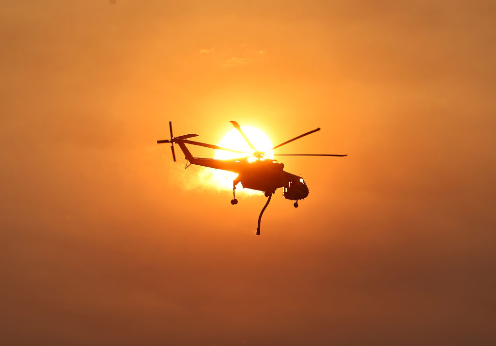 一架消防直升机在加利福尼亚洛杉矶附近的洛斯奥利沃斯市附近灭火。