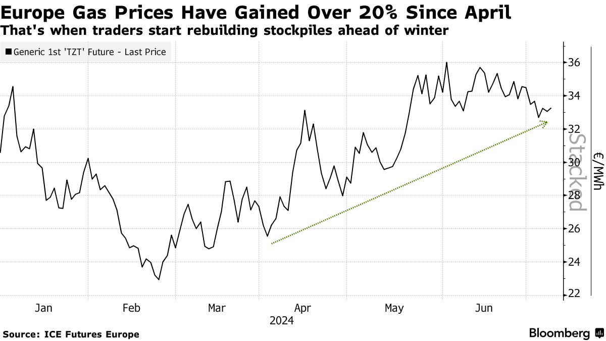 基准期货周一上涨了多达1.7%。尽管欧洲的天然气库存在这个时候已经充足,但它所依赖的全球市场最近出现了一系列干扰,包括未经计划的停工和由于世界某些地区对空调需求增加而导致的需求激增。自从交易商从4月开始囤积以来,价格已经上涨了超过20%。