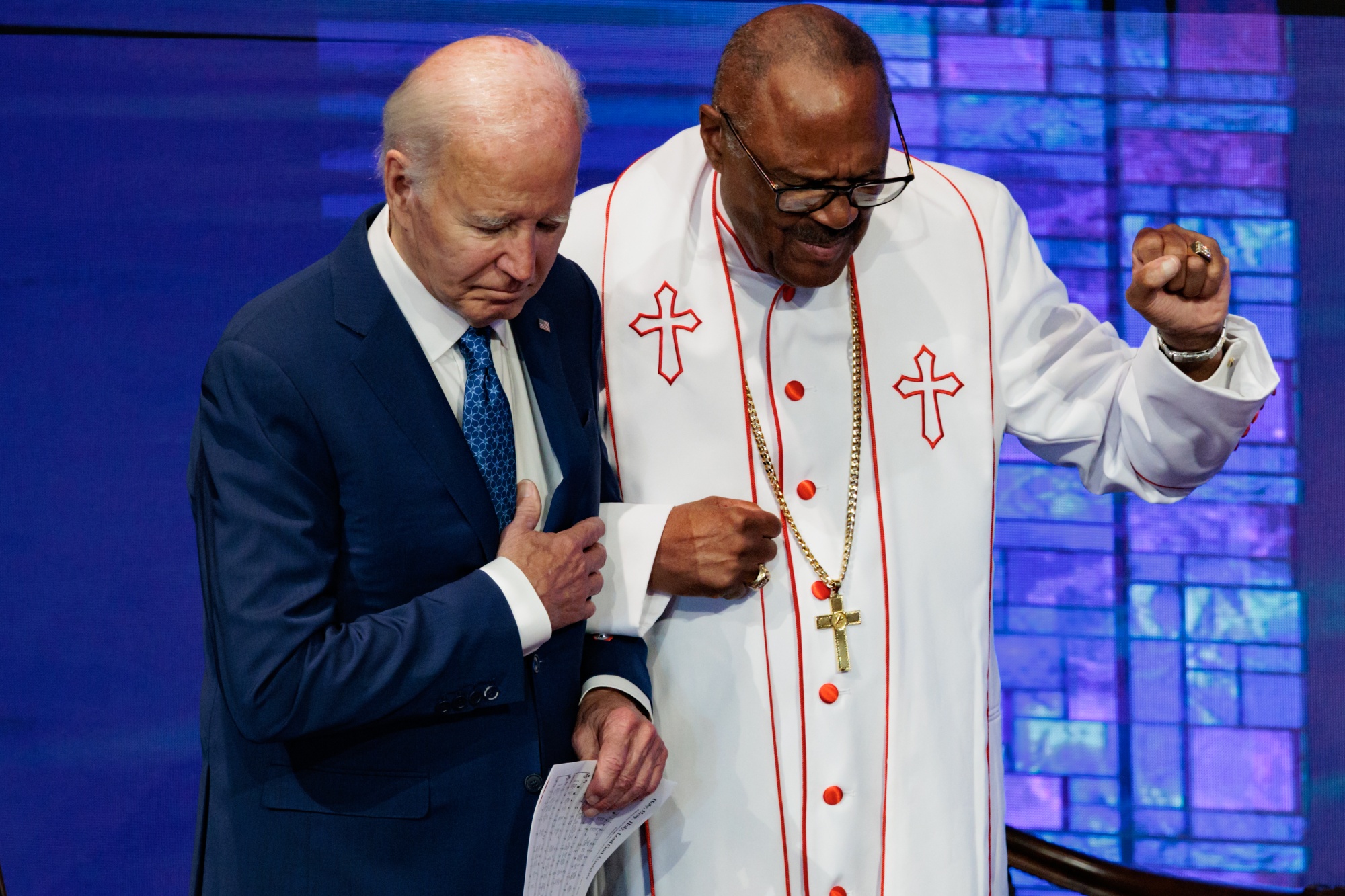 美国总统乔·拜登(Joe Biden)(左)与菲拉德尔菲亚艾尔利山基督教会(Church of God in Christ Mt. Airy)的主教欧内斯特·C·莫里斯(Ernest C. Morris Sr.)在7月7日的教堂内。摄影师:汉娜·贝尔(Hannah Beier)/彭博社本周二上午计划举行的众议院所有民主党人的会议将更加揭示该党内的情绪。参加会议的成员中包括那些在连任竞选中面临激烈竞争并担心对拜登支持减少的影响。