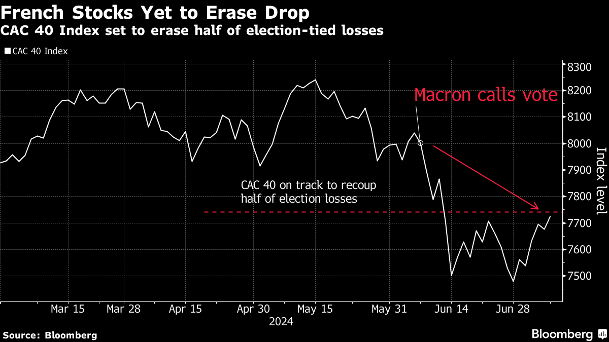 法国股市今日大涨,因为该国的临时立法选举使得国民议会没有任何一党获得多数席位,尽管投资者警告称市场动荡在即,政治僵局逼近。