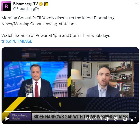 今天在彭博电视台的权力平衡早间版节目中,主持人乔·马修采访了晨间咨询公司的伊莱·约克利,谈论了最新的彭博新闻/晨间咨询摇摆州民意调查。
