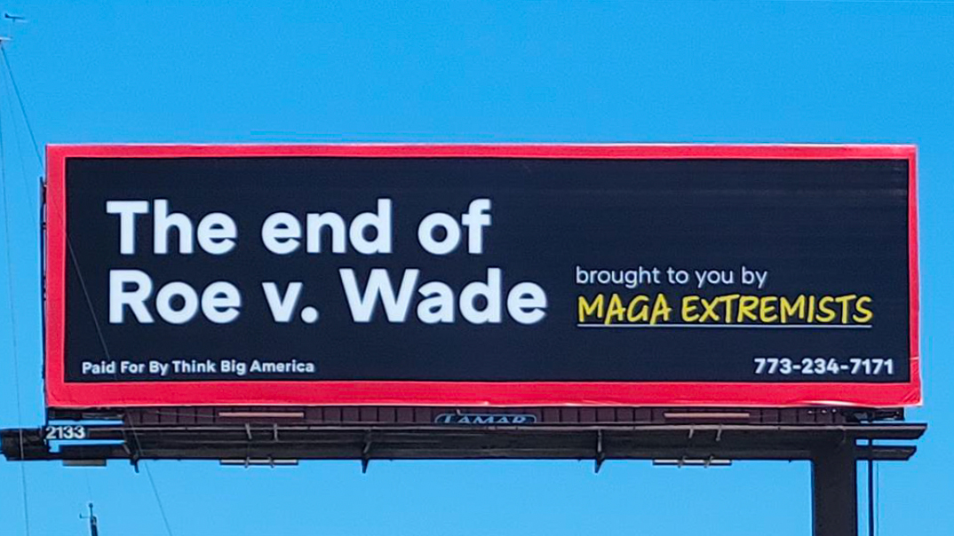靠近威斯康星州最大城市的广告牌本月初放置,将持续到大会结束,Think Big America发言人克里斯蒂娜·阿梅斯托伊表示。其中一块广告牌上写着:“MAGA极端分子本周在城里提名一个希望全国禁止堕胎的总统。阻止他们。投票。”