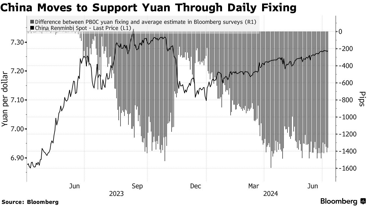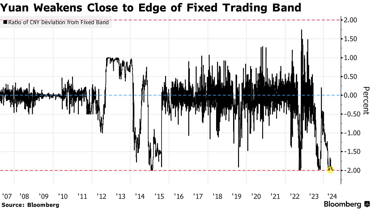 由于延迟的美国降息预期和中国更多货币宽松政策的前景支持了美元,北京一直为管理的货币设定比预期更强劲的每日参考汇率。有时,甚至国有银行也会出售美元以遏制人民币的压力,今年以来人民币贬值超过2%,跌至去年11月以来的最低水平。
