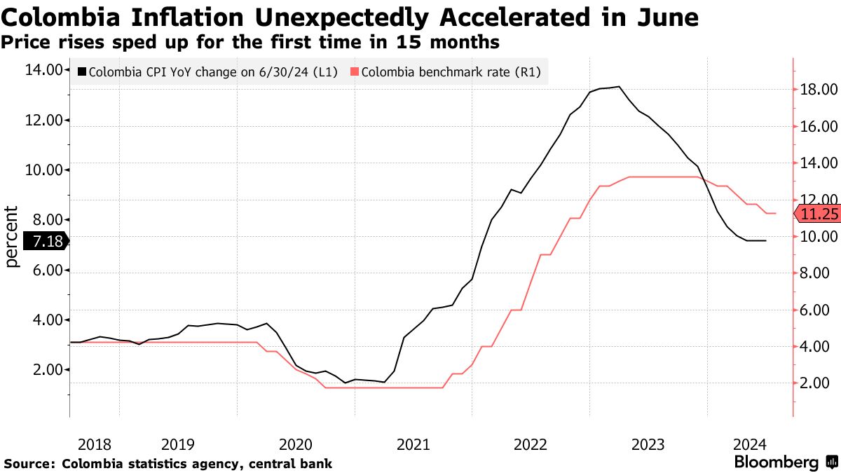 六月会议记录显示,大多数决策者仍然认为存在通胀风险,而少数人认为必须大幅降息才能促进投资复苏,并在未来几年将增长推近潜在水平。哥伦比亚比索在过去一个月中贬值了2.8%,是新兴市场中跌幅最大的,进一步复杂化了通胀前景。