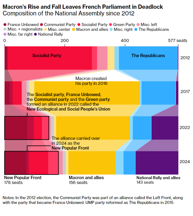 尽管马克龙的中间派最终排名第二,但他的权力基础进一步缩小,并受到玛琳·勒庞的极右翼国民集会和一个名为新人民阵线的左翼联盟的围困。