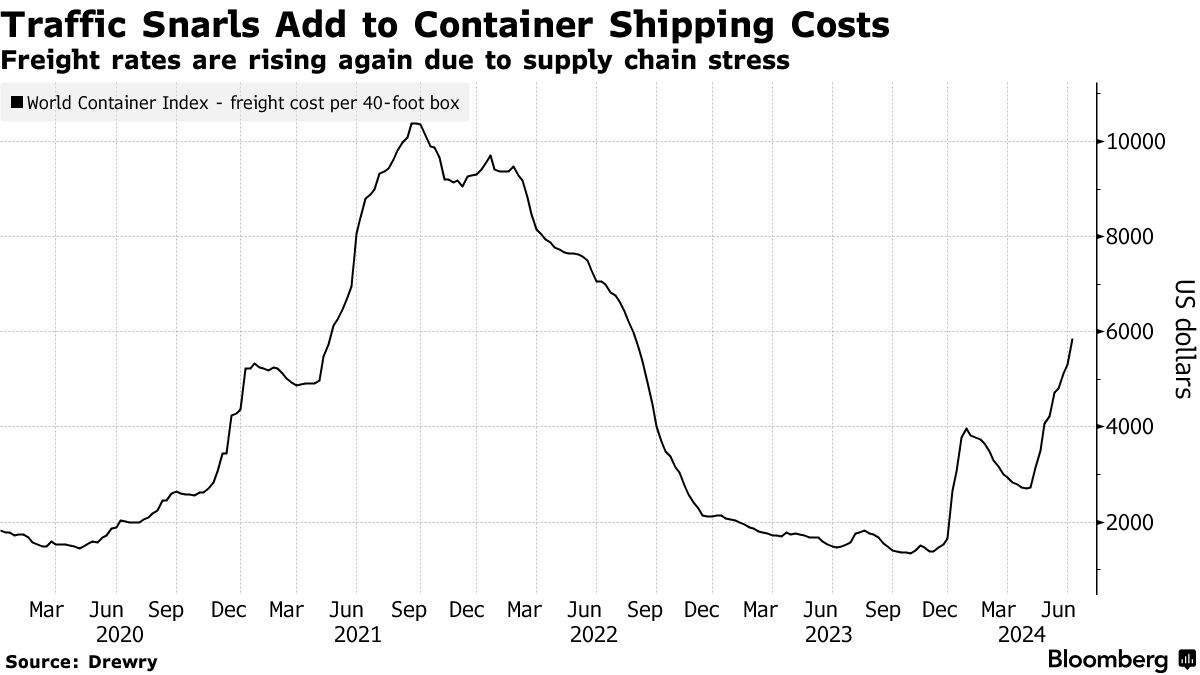 货运港口的拥堵可能会持续到8月,分析师表示。船舶集装箱运价因延误和改道而激增。