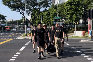 一群露营者在新加坡背负60公斤的负重,作为一个培训项目的一部分,旨在成为更好的领导者。摄影师:Olivia Poh/Bloomberg