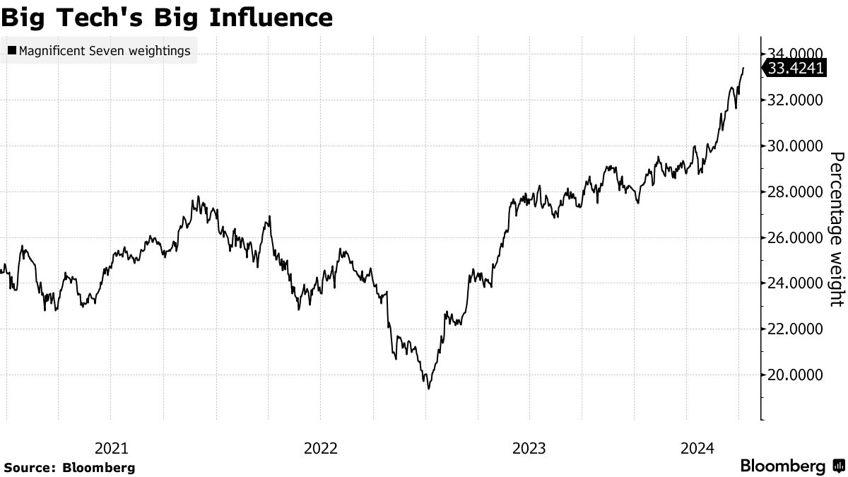 今年市场的上涨既反映了大盘股的强劲涨势,也反映了它们在主要指数中的影响力。包括特斯拉在内的“辉煌七人组”今年上涨了1.8%,占据了标普500指数市值的创纪录33.4%,根据彭博社编制的数据。