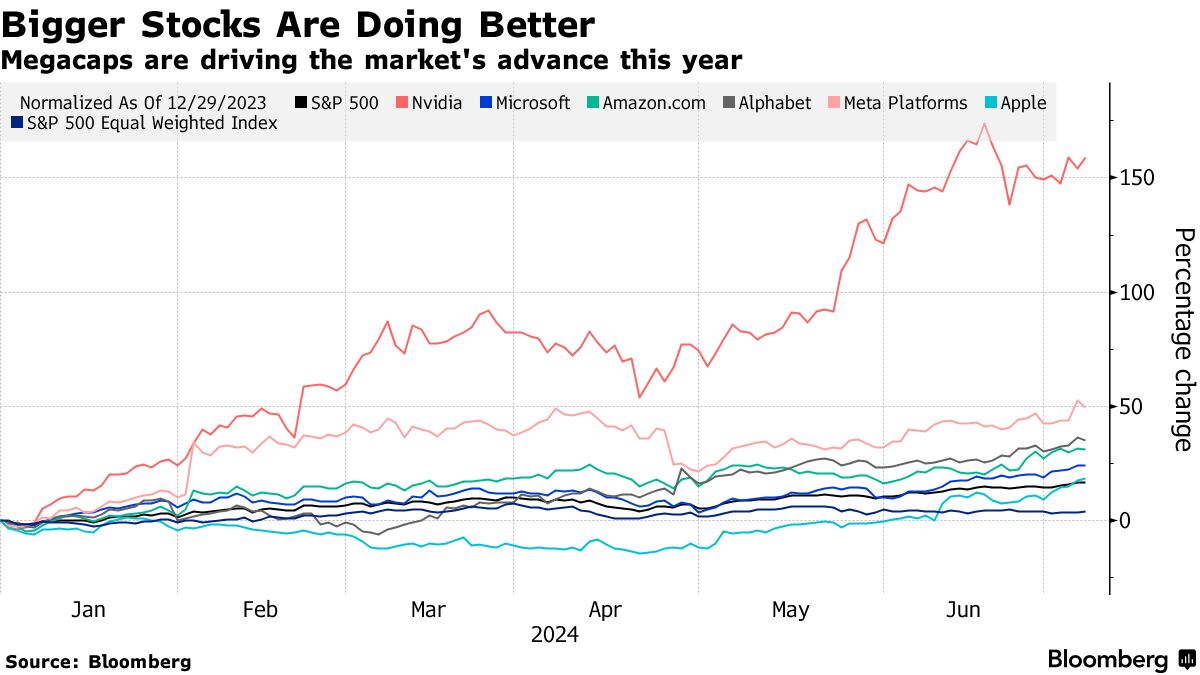 标普500指数的等权重版本今年上涨了仅有3.9%,大盘股正在以历史性的优势击败小盘股。