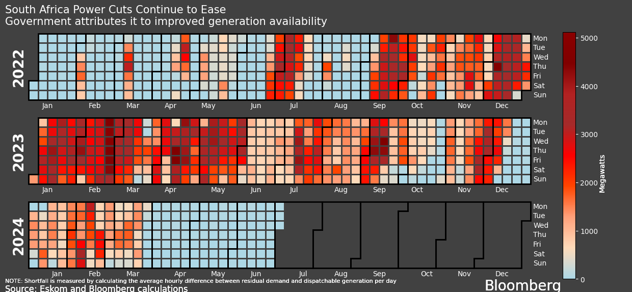 彭博社南非去年经历了创纪录的停电,并连续遭受超过15年的定期停电。今年这个问题有所缓解,该国取得了一个重要里程碑 — 连续100天供电。“重要的是要记住,煤电机组老化并且在过去十年里一直未得到维护,”资产管理公司艾伦格雷的投资分析师雷恩·亚当斯说。“机组故障仍然可能发生,但目前我认为这是积极的进展。”