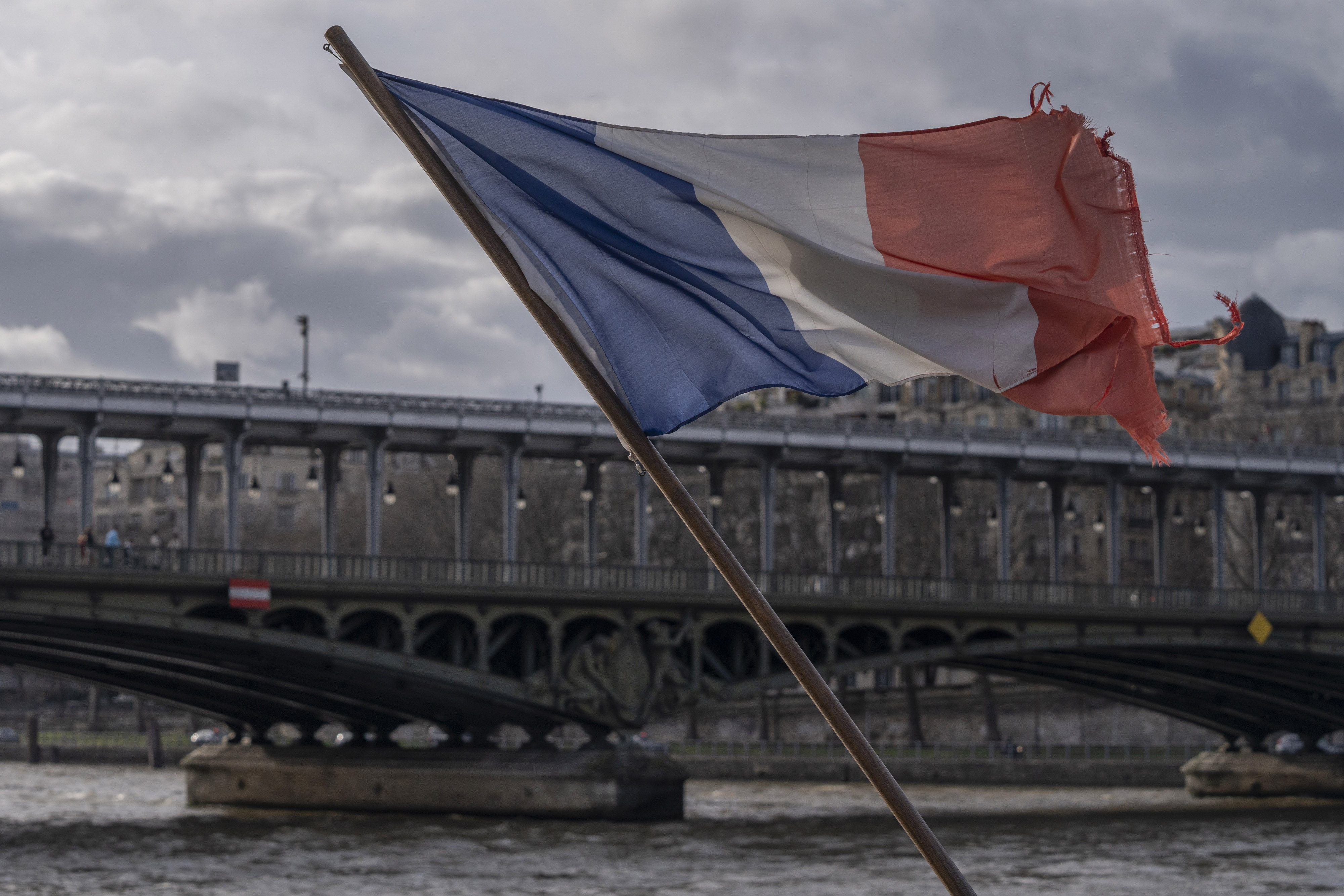 一面法国国旗飘扬在塞纳河上的一艘游船上,位于法国巴黎市中心,2024年2月14日星期三。