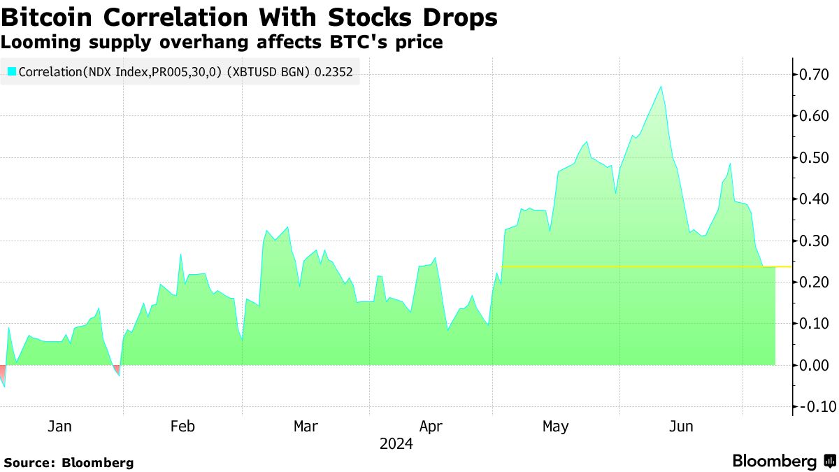 在最近几个月几乎同步交易之后,比特币与飙升的美国股市的相关性正在因供应过剩和对加密货币需求不足的压力而崩溃。