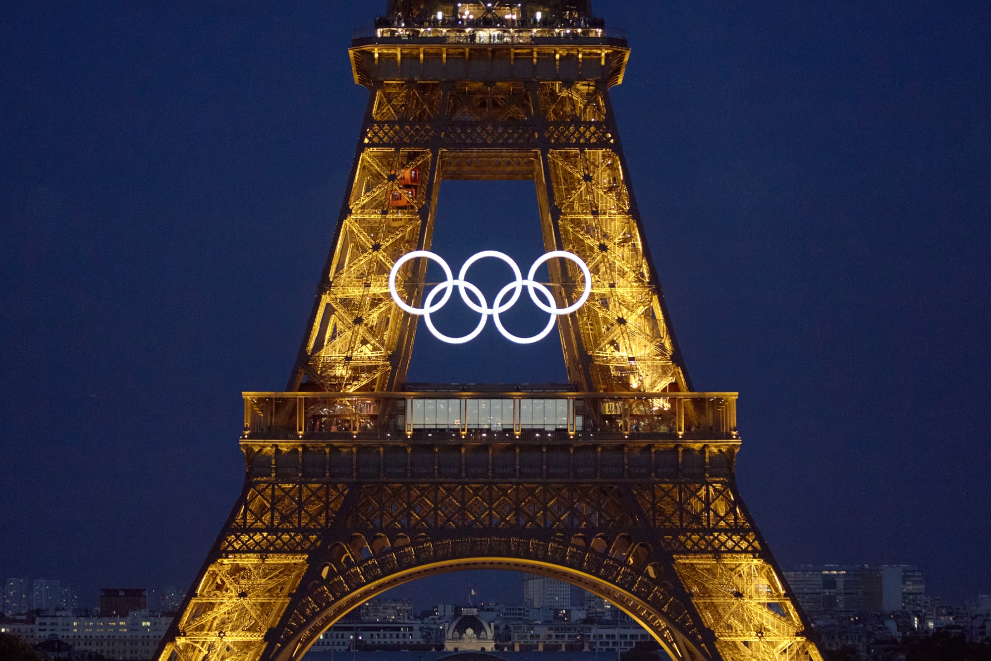 奥运五环装饰着巴黎的埃菲尔铁塔。