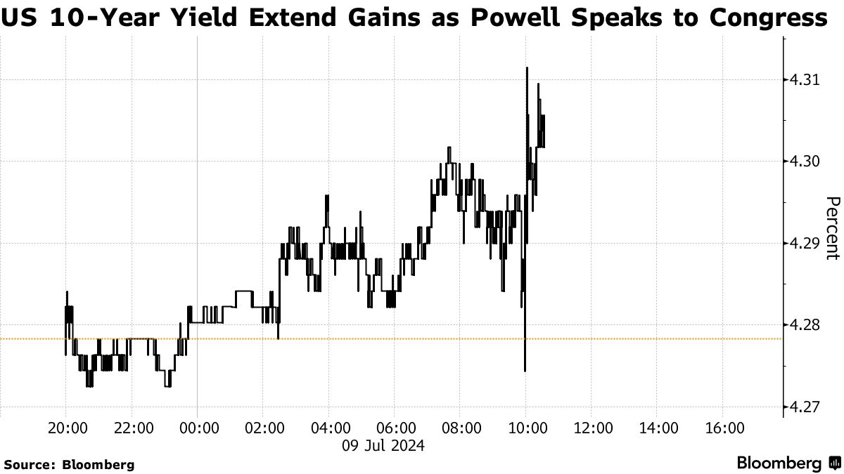 美国政府债券的下跌推高了收益率,因为鲍威尔在周二参加参议院听证会时作证,标准10年期收益率上涨了近五个基点,达到4.325%。掉期交易商坚守他们对今年两次降息的预期,市场预计联储在9月份降息的概率略高于70%。