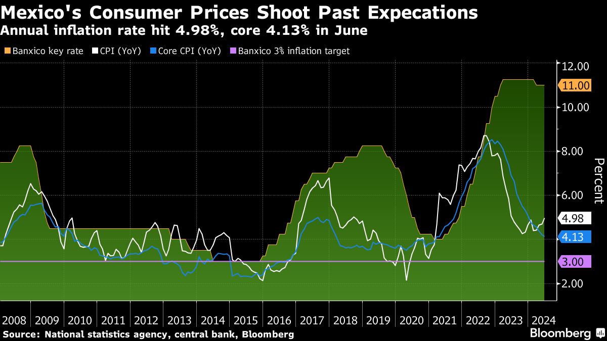 墨西哥的通货膨胀在六月份加速,超出预期,这使得央行努力降低接近创纪录水平的利率变得更加困难。