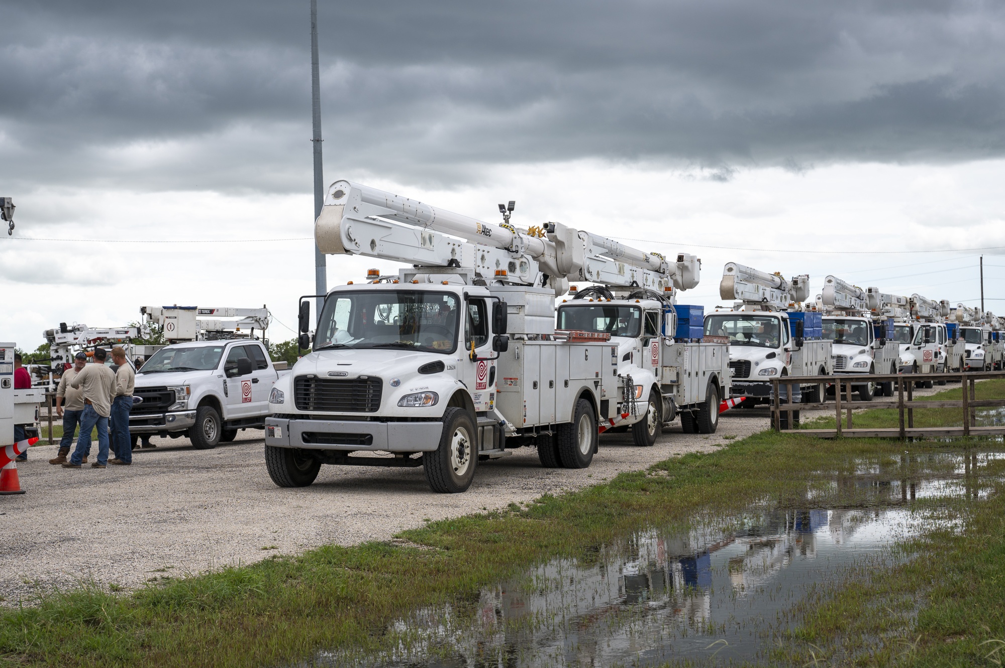 飓风贝瑞尔于7月8日登陆德克萨斯州贝城附近后,电力公司服务车辆聚集在一起。