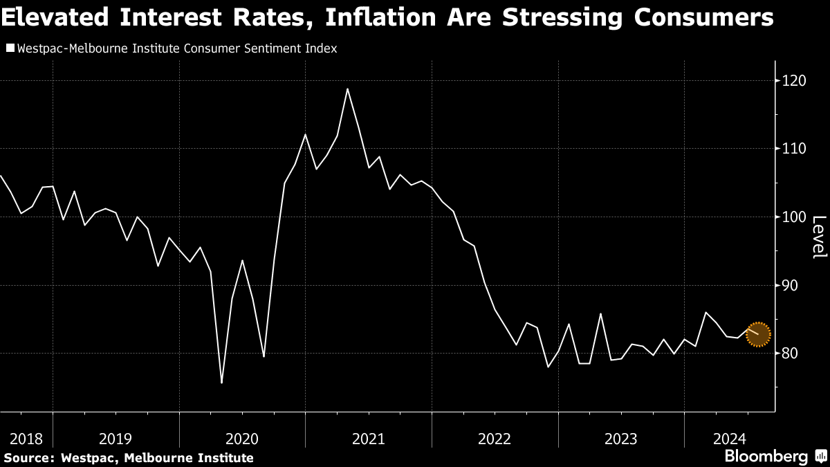 消费者在澳大利亚仍然感到沮丧,部分原因是由于持续的通货膨胀,西太平洋银行的一项调查显示,人们担心再次加息。在新西兰,中央银行计划在周三保持 借贷成本 较高,以遏制价格压力,尽管经济陷入困境。