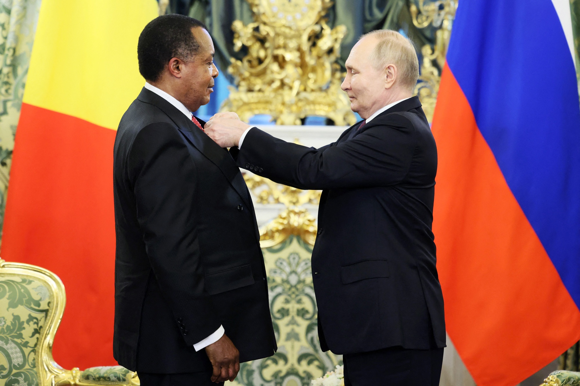 普京在莫斯科克里姆林宫于6月27日授予刚果共和国总统丹尼斯·萨苏-恩圭索荣誉勋章,这张照片由俄罗斯国家媒体发布。摄影师:MIKHAIL METZEL/AFP更多高层外交即将到来,俄罗斯将于十月在喀山举办扩大版的金砖国家峰会。这很可能会给普京与巴西、印度、中国、南非、伊朗、埃及、埃塞俄比亚和阿联酋领导人会面的机会。