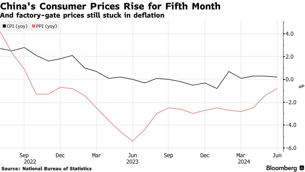 中国的消费价格在6月份再次微弱上涨,接近零,为第五个月,这表明通缩压力继续阻碍经济复苏。