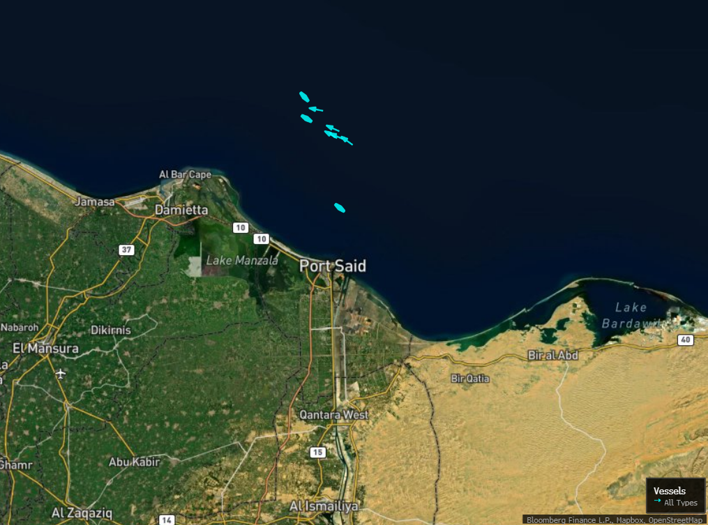 在苏伊士运河北端的塞得港,有八艘被制裁的油轮聚集在那里。它们自抵达以来一直处于停滞状态。