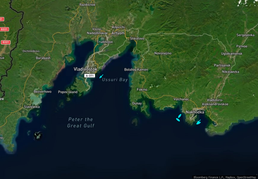 停泊在符拉迪沃斯托克和科兹米诺港口城市附近的水域,另外五艘船只 — 其中一艘除外,都归俄罗斯联邦海洋公司所有 — 已经数月停泊。另外两艘在俄罗斯和日本海岸之间徘徊,没有指定目的地。