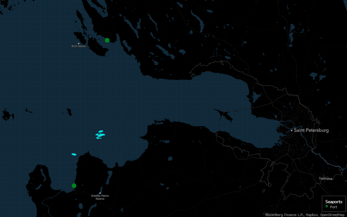 有六艘原油油轮停泊在波罗的海,那里是普里莫尔斯克和乌斯季卢加两个俄罗斯最大的出口终端的所在地。这些船只聚集在芬兰湾南岸的乌斯季卢加港口外。