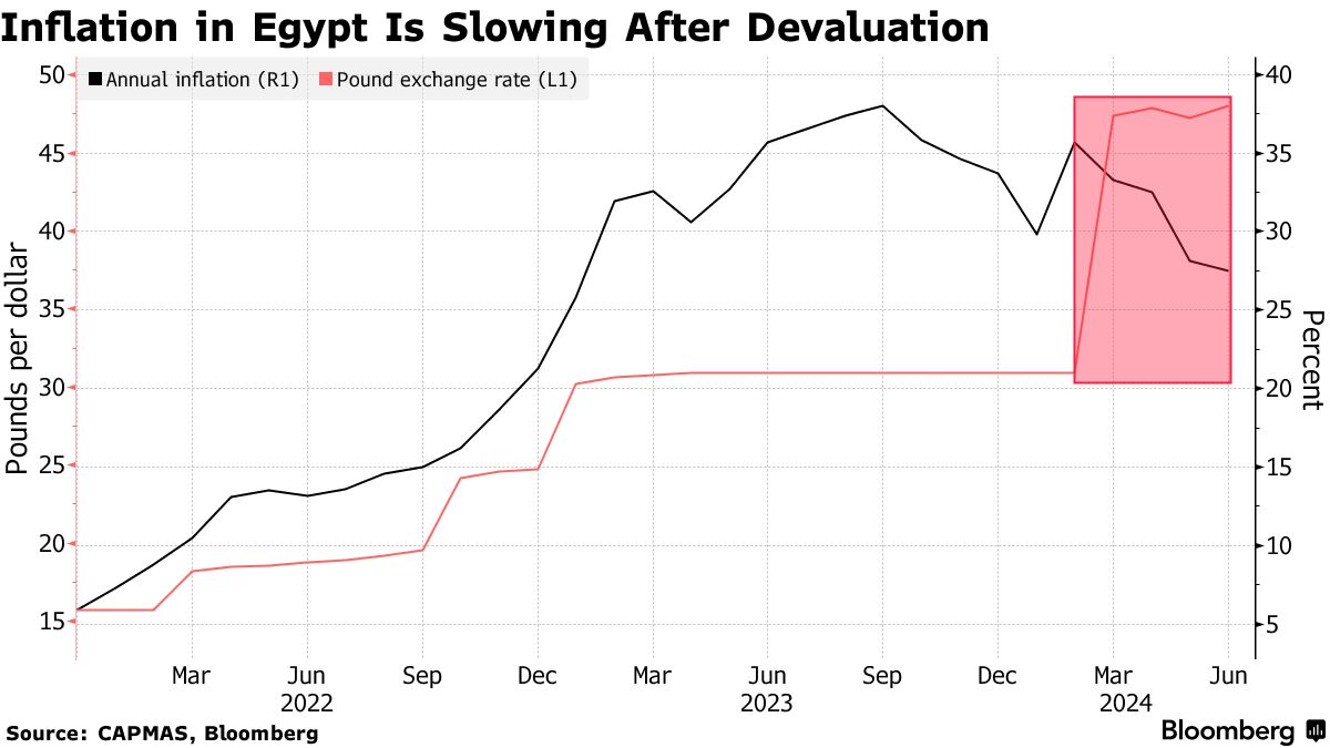 埃及消费者价格在过去9个月中有8个月创下历史新高后开始放缓,即使在2024年世界上最大的一次贬值之后,埃及镑对美元贬值了近40%。通货膨胀并没有再次激增,这表明现在已经平息的本地黑市上货币的价值大幅下降已经影响到了零售商的定价。