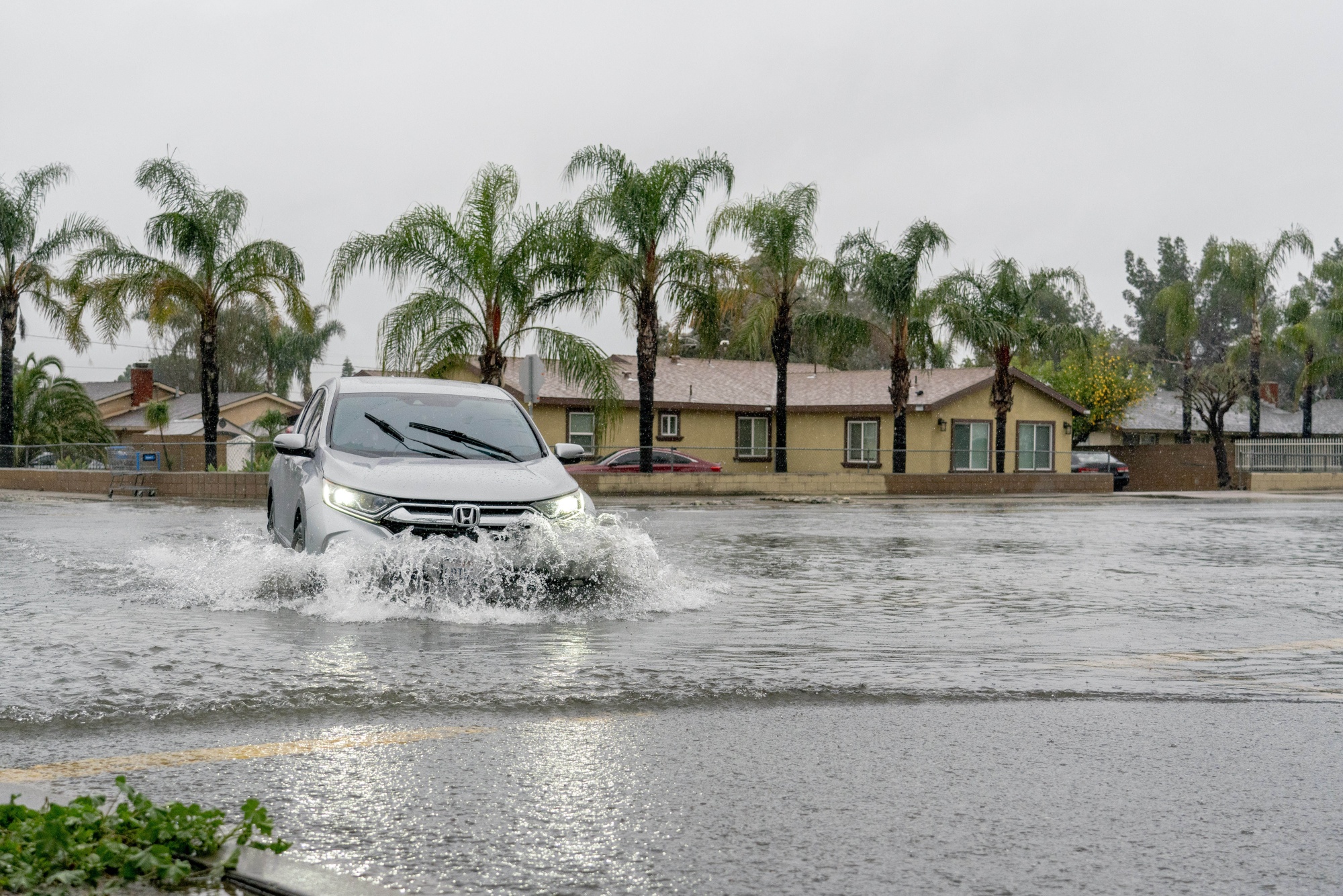 一名司机在加利福尼亚州Fontana的一场风暴中穿越洪水。
