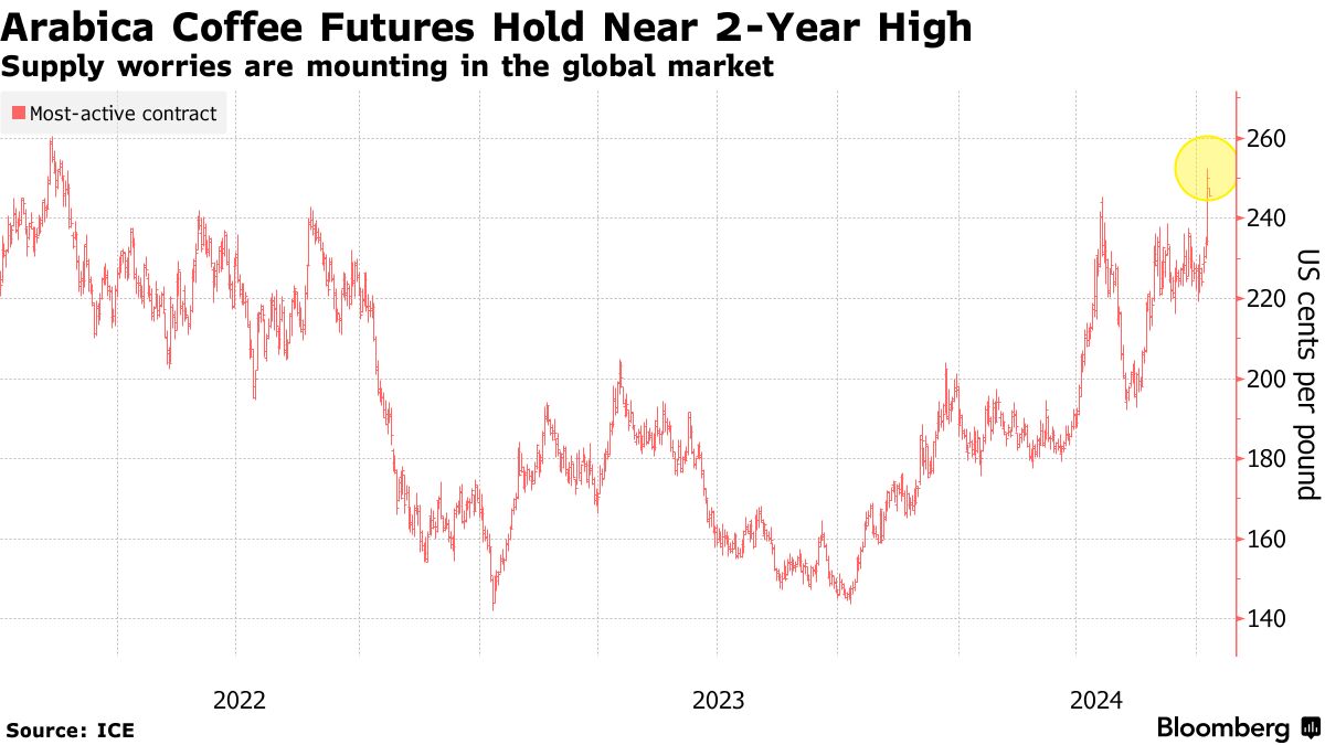 纽约市场上最活跃的阿拉比卡咖啡期货合约下跌了1.5%,至每磅2.465美元,此前周二曾升至自2022年初以来的最高水平。尽管如此,2024年的价格仍比去年高出约30%,因廉价罗布斯塔咖啡的短缺推动了对高端阿拉比卡咖啡的需求,后者受到星巴克和雀巢旗下尼斯布莱所青睐。