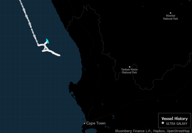 周三,南非沿海的MV Ultra Galaxy。出于安全原因,南非沿海的港口已经减少了活动。Transnet公司在周二晚间表示,由于海浪汹涌,一些港口的船只运行已经暂停,公司正在“持续监控运营情况”。本周早些时候,A.P. Moller-Maersk A/S 发出警告,称可能会出现持续数天的延误。