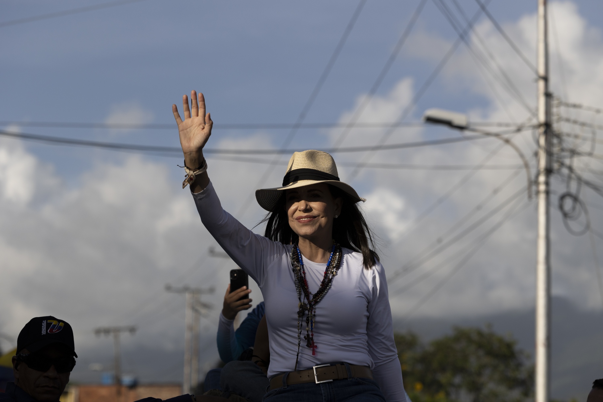 玛丽亚·科里娜·马查多在圣克里斯托瓦尔的集会上向支持者致意。