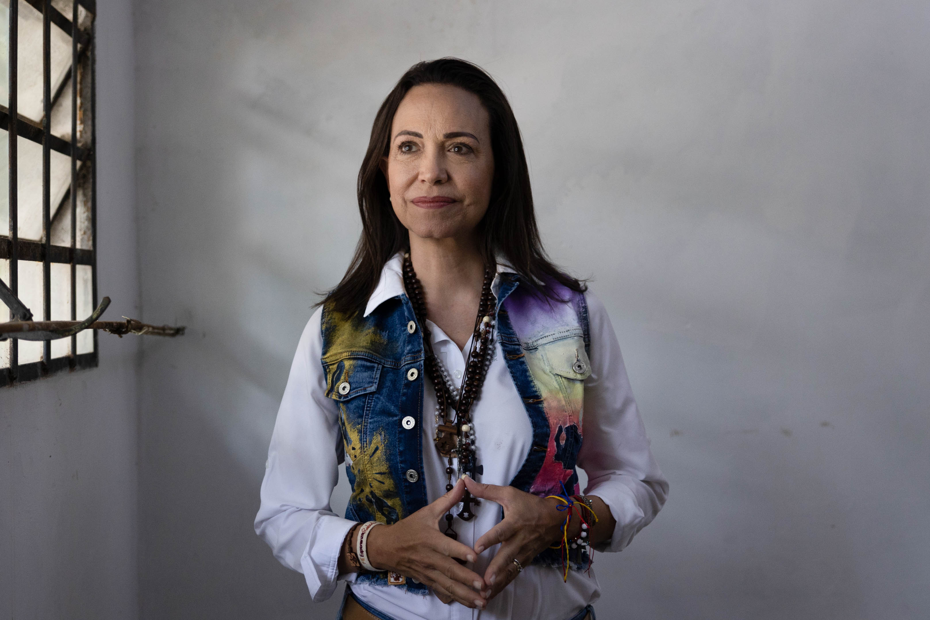马查多通常戴着支持者送的几十串念珠在全国各地竞选。摄影师:法比奥拉·费雷罗/彭博社