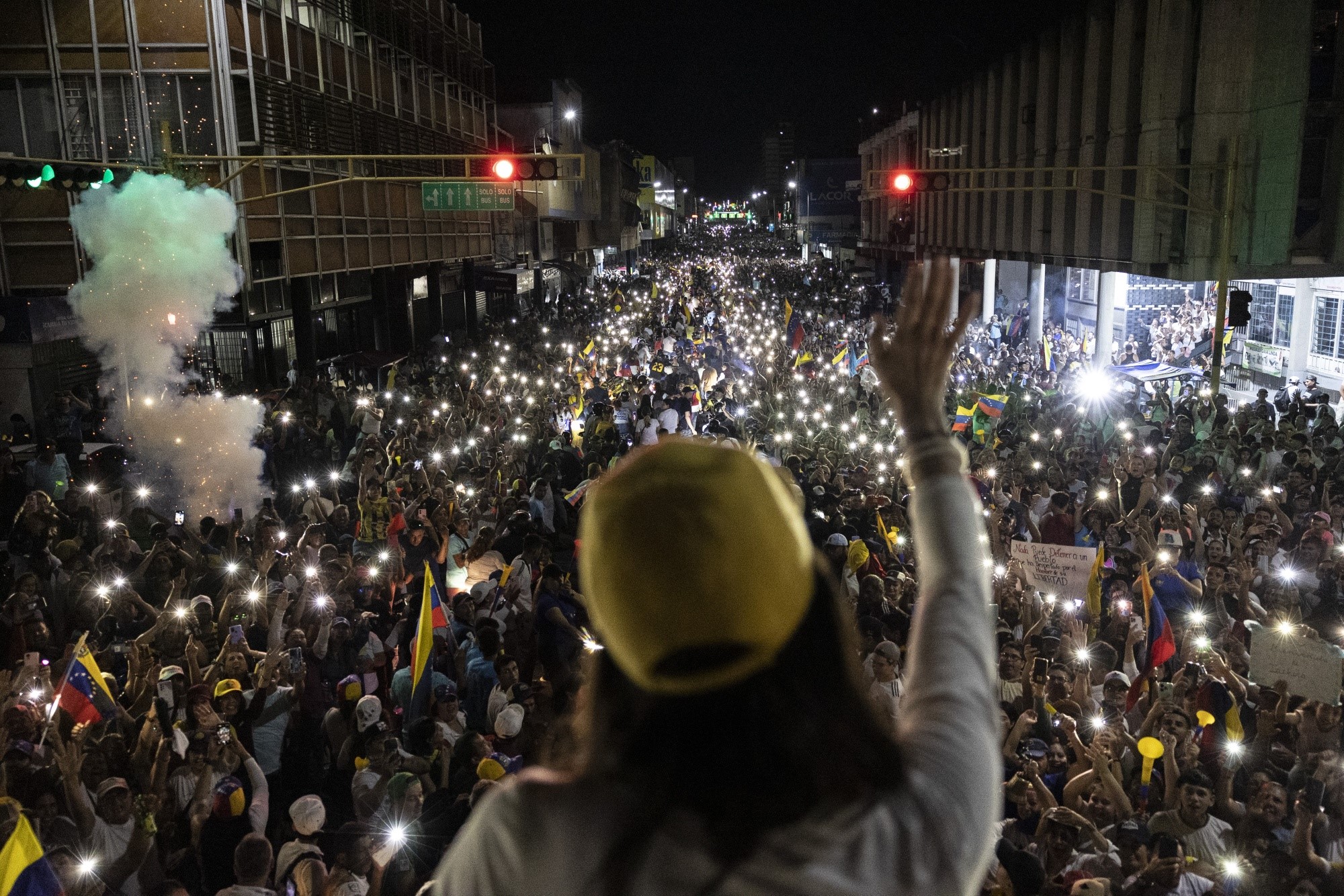 支持者们经常举起手机,让家人通过视频通话看到马查多。照片:Fabiola Ferrero/Bloomberg“一切都在告诉我们委内瑞拉人民对延迟生活的渴望”,社会心理学博士、社会运动专家玛丽亚·特蕾莎·乌里兹泰塔说。“每当一个人的生活项目被中断,家庭发生裂痕,那就像留下了一个伤口,一种创伤,这是一种因失去和被剥夺最基本权利而逐渐形成的集体哀悼”