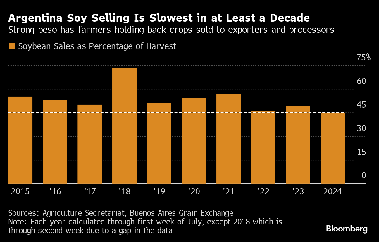 根据彭博新闻分析的政府数据,阿根廷大豆销售速度至少是十年来最慢的。巴黎人在7月3日之前售出了2280万吨,仅为收成的45%。多年来,农民通过出售足够的大豆来支付账单并保留剩余部分来保护他们的资产负债表免受阿根廷波动的货币影响,这令出口商和加工商感到沮丧。今年,这一趋势加剧,因为比索 被高估了。