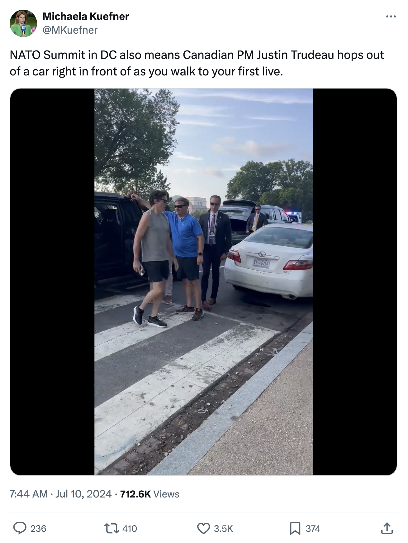 有人在北约订购了一个纹身的加拿大总理穿着亚瑟士运动鞋和运动背心吗?因为这就是 华盛顿的炎热 给我们带来的,我对此并不生气!但是 有些 人生气了,因为贾斯汀·特鲁多的黑色SUV车队让他们迟到了 20分钟 上班。说真的,谁会开一辆雪弗兰Suburban去 跑步 在国家广场?