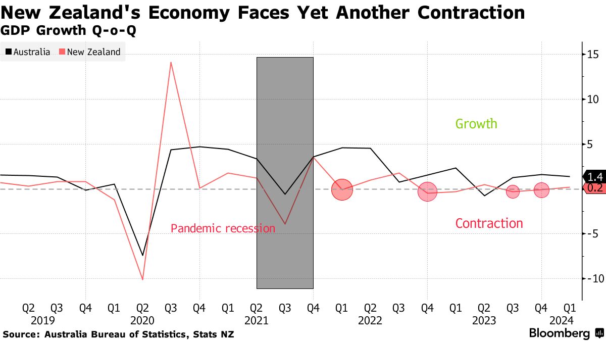 新西兰经历了双底衰退,经济很可能在截至六月的三个月中再次收缩,这意味着过去七个季度中有五个季度的国内生产总值下降。除了疫情期间的收缩外,自上世纪90年代以来,澳大利亚没有经历过衰退。