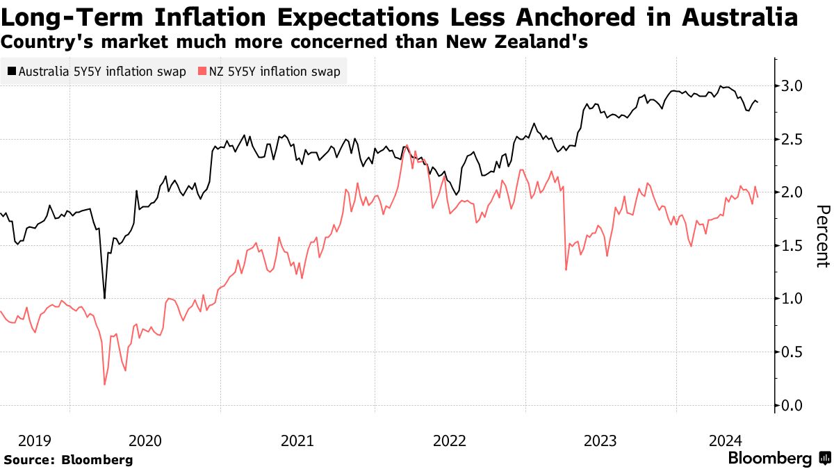 澳洲联邦储备银行面临的一个问题是,澳大利亚的通胀预期没有像新西兰那样保持稳定。上周澳洲联邦储备银行六月份董事会会议纪要显示,决策者们正在“密切监测”长期通胀预期,称如果通胀预期出现上升,将需要“明显提高利率”。