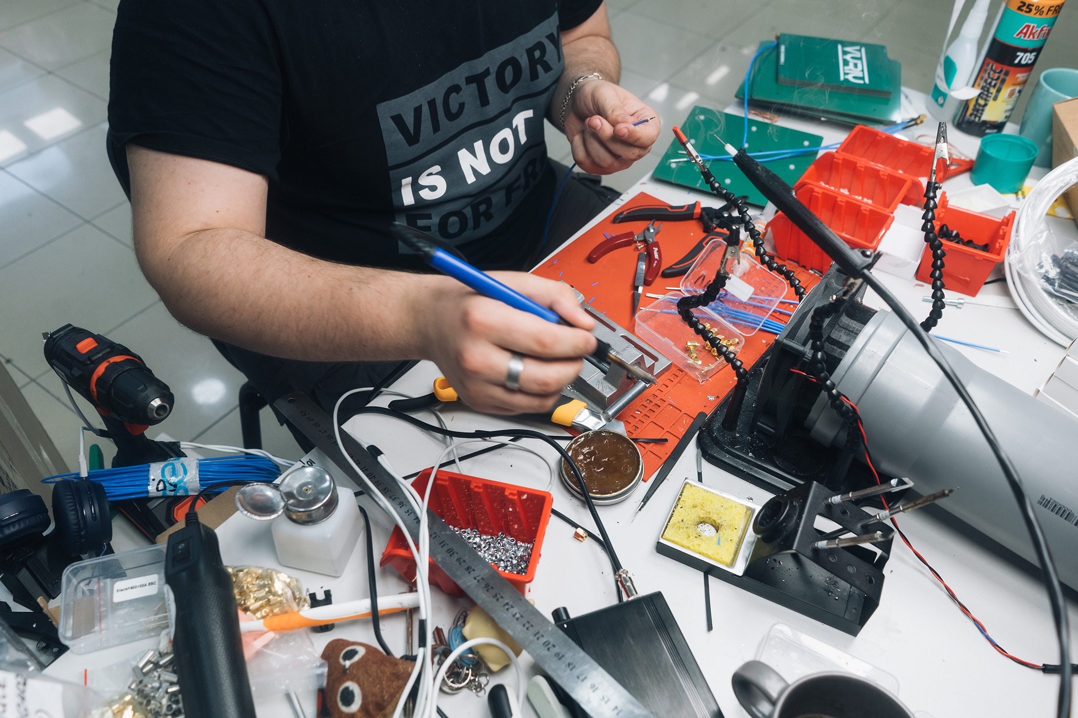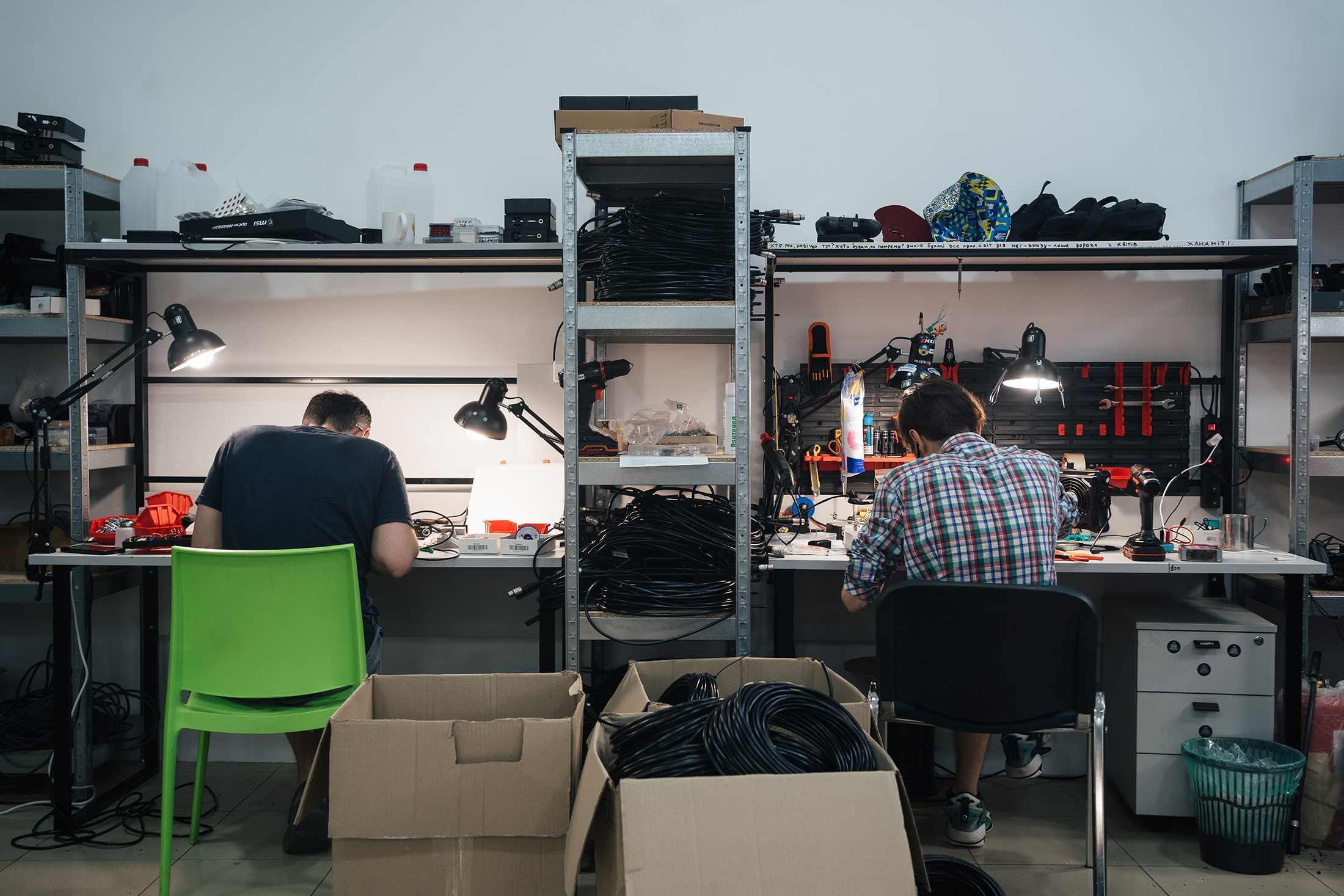 维里的技术人员手工将电机、摄像头和主板螺栓焊接在一起,伴随着风扇和电动螺丝刀的持续嗡嗡声。侧房间里有几台3D打印机正在制造用于测试的新无人机机架。当一架无人机完成时,它被带到楼上进行快速飞行检查,包括几个环形飞行。然后将其放在一边进行包装并交付到前线。一周内,一些将执行摧毁俄罗斯车辆或排的单程任务。