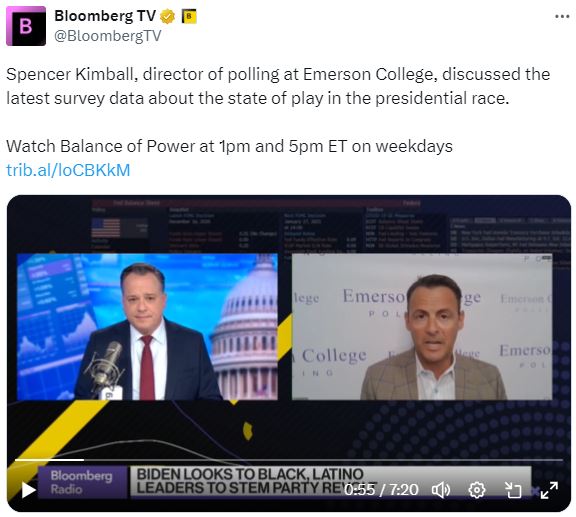 今天在彭博电视台的权力平衡早间版节目中,主持人乔·马修和凯莉·莱因兹采访了埃默森学院民意调查主任斯宾塞·金博尔,谈论总统竞选中的最新调查数据。