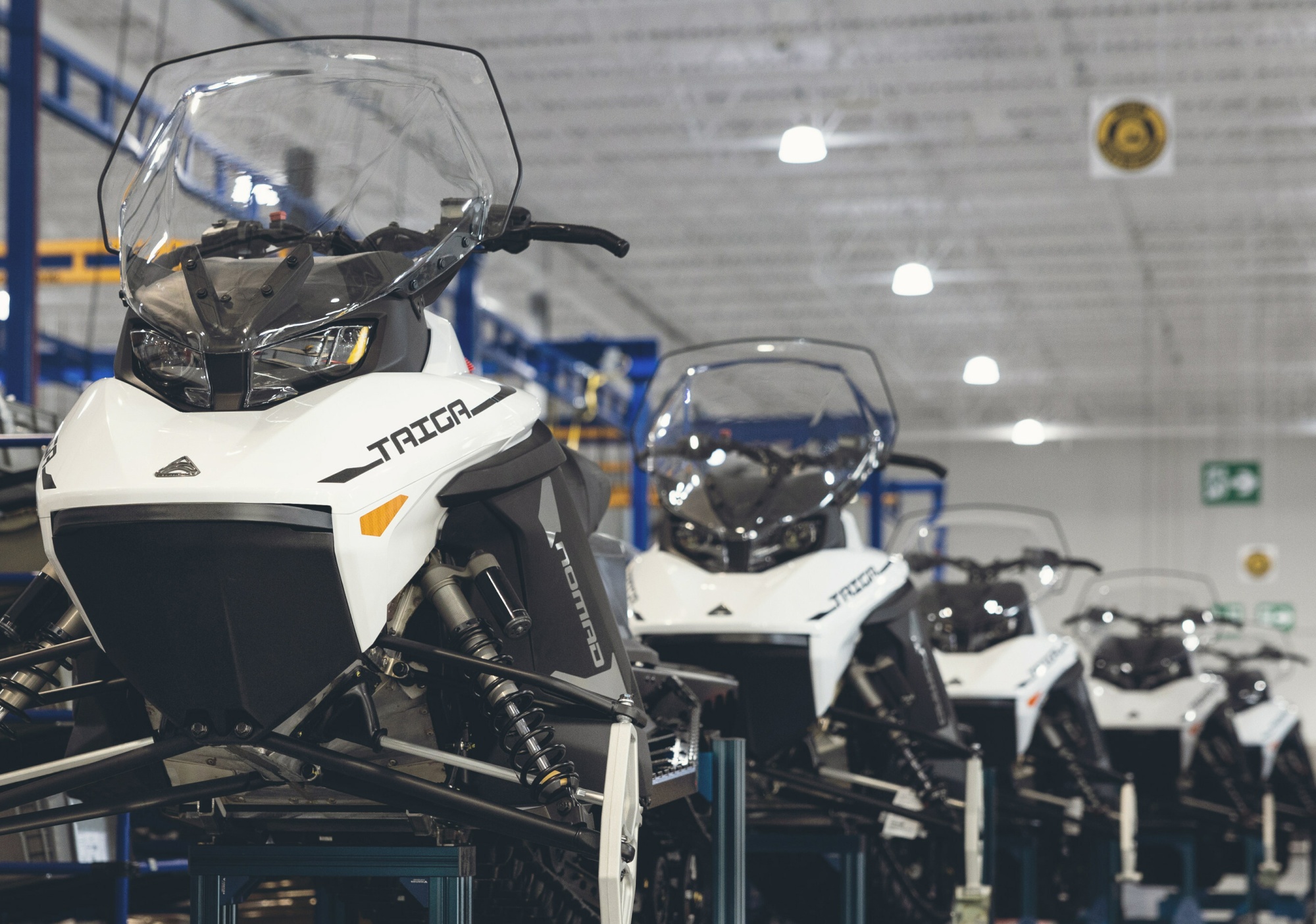 泰加的游牧雪地摩托车正在生产线上。